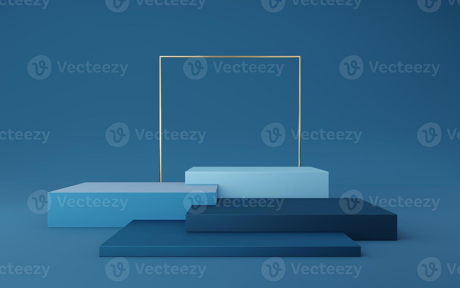 Empty blue cube podium and gold square on blue background. Abstract minimal studio 3d geometric shape object. Mockup space for display of product design. 3d rendering. Pro Photo