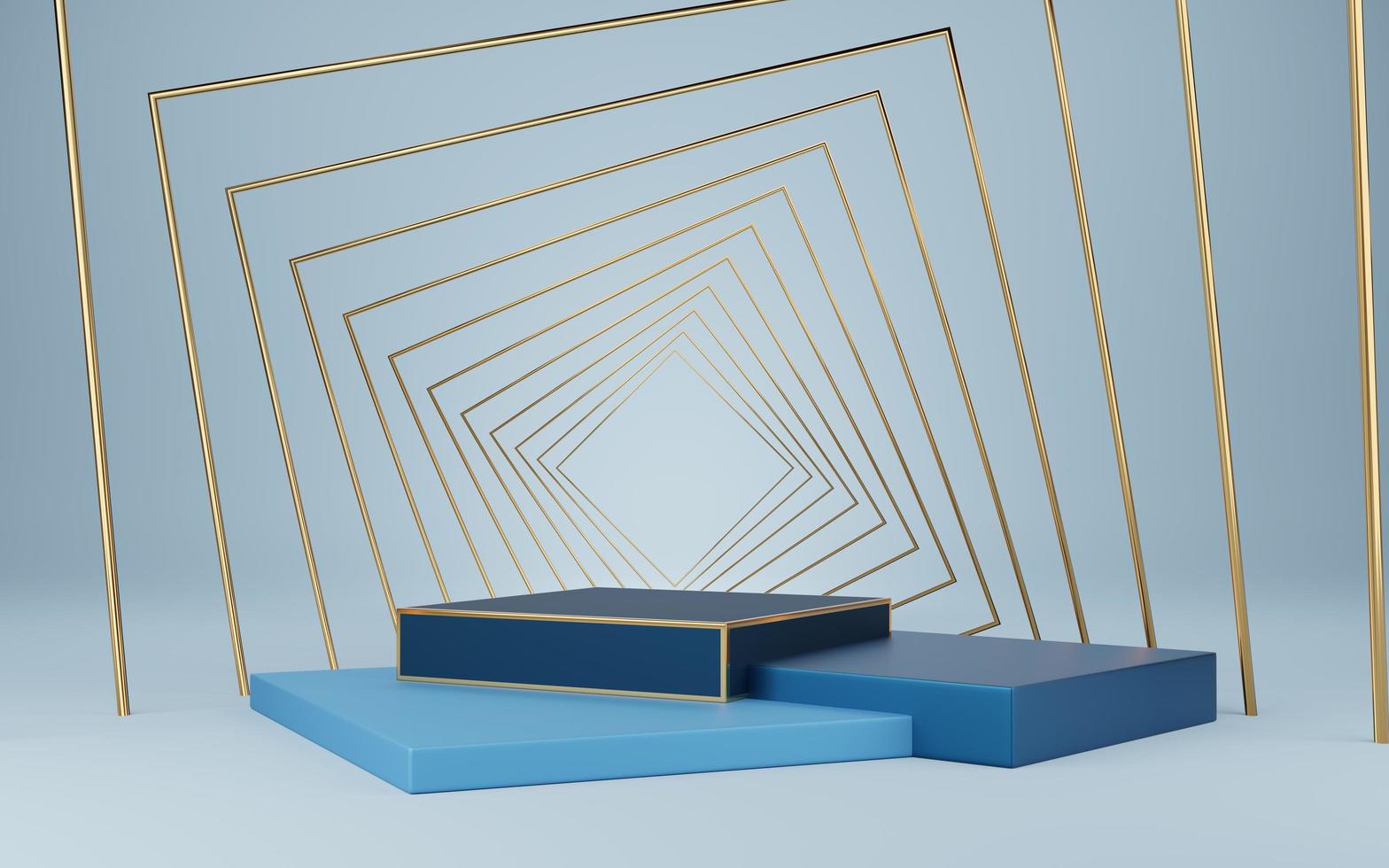 Empty blue cube podium with gold border and gold square on gray background. Abstract minimal studio 3d geometric shape object. Mockup space for display of product design. 3d rendering. Free Photo