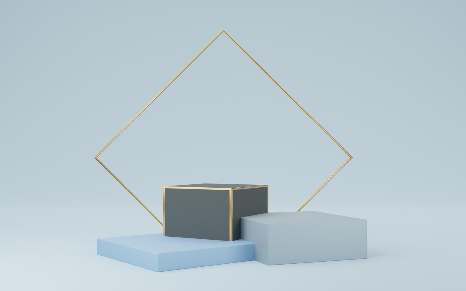 Empty black and blue cube podium with gold border and gold square on gray background. Abstract minimal studio 3d geometric shape object. Mockup space for display of product design. 3d rendering. photo