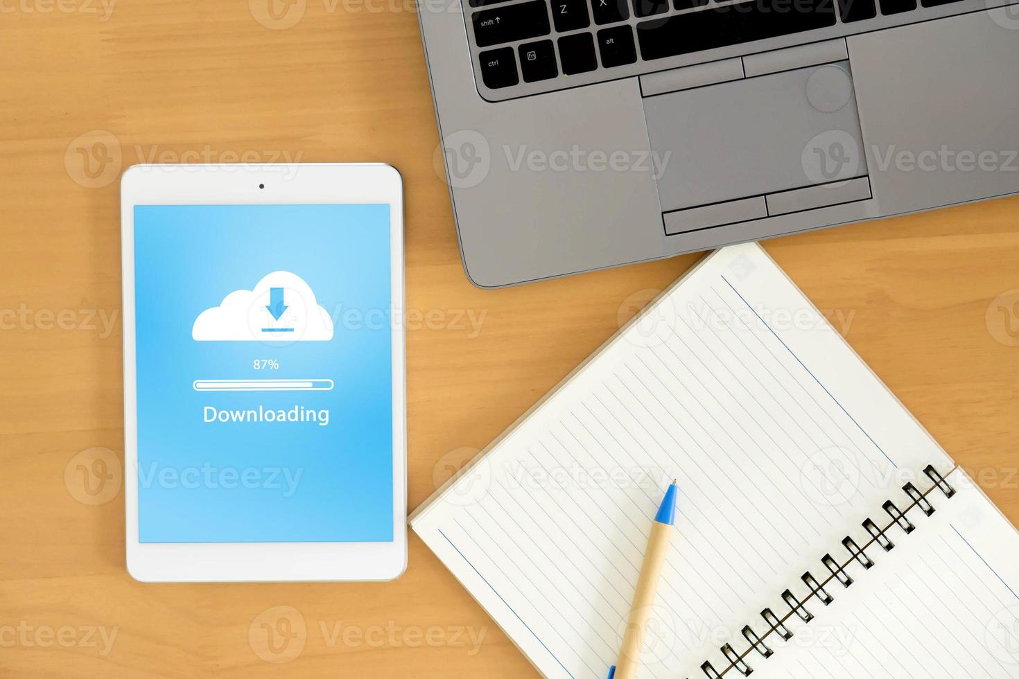 top view of business workspace to cloud uploading , notebook and female hands typing on keyboard Pro Photo