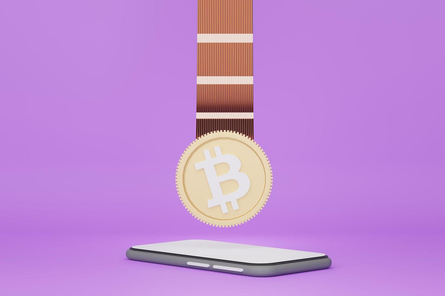 3d render of bitcoin that connect to other network with smartphone. Blockchain system connection concept. photo