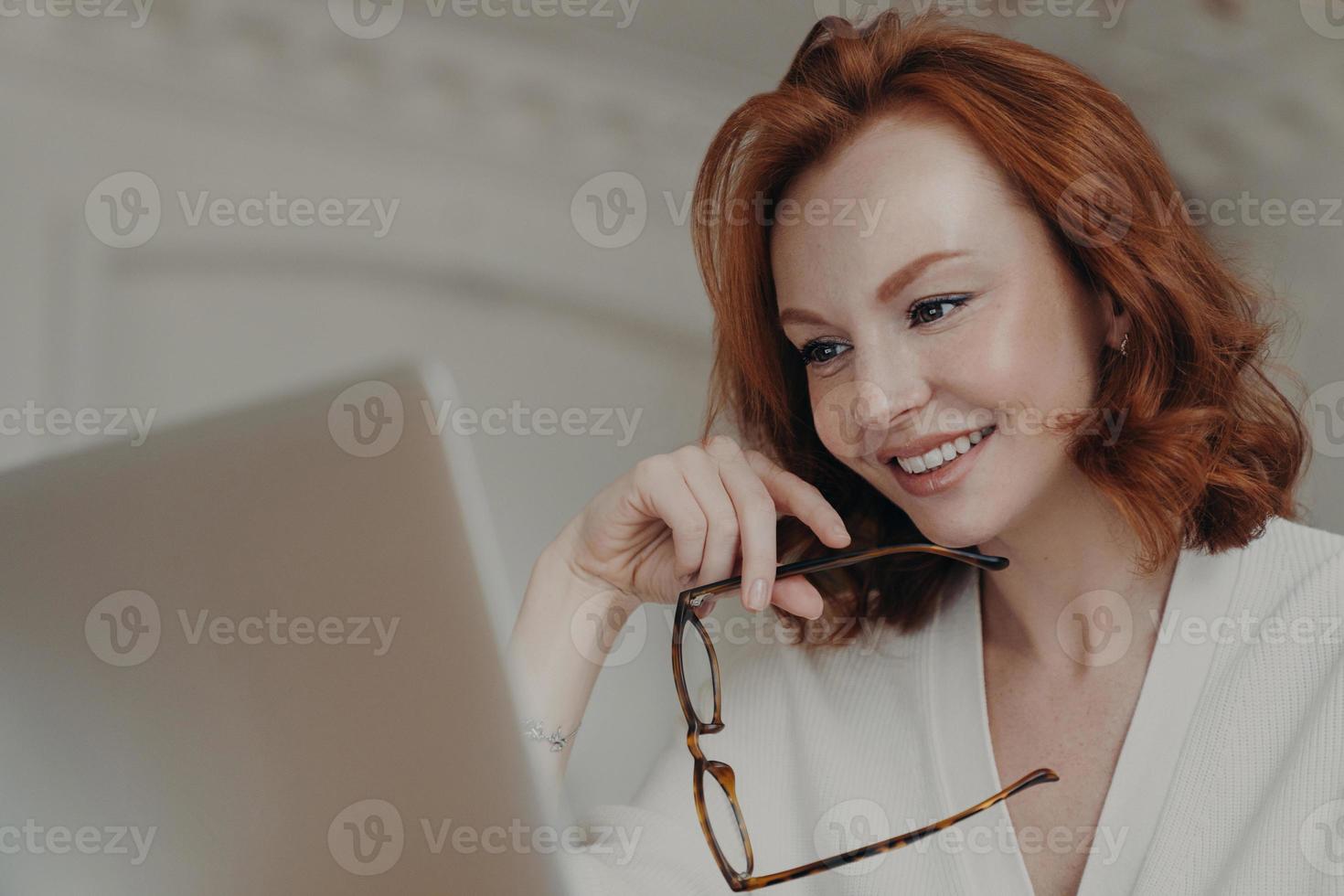 Professional smiling ginger female web designer uses application on laptop computer for creating project work, makes online research and browses internet, holds spectacles, has happy expression Pro Photo