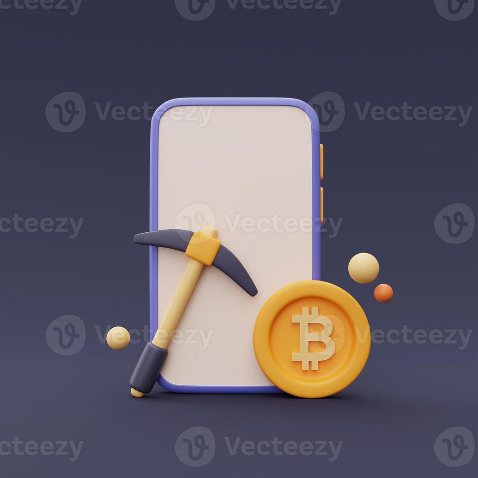 Bitcoin mining concept with Pickaxe,Bitcoin coin and smartphone,Cryptocurrency,blockchain technology services,minimal style.3d rendering. Pro Photo