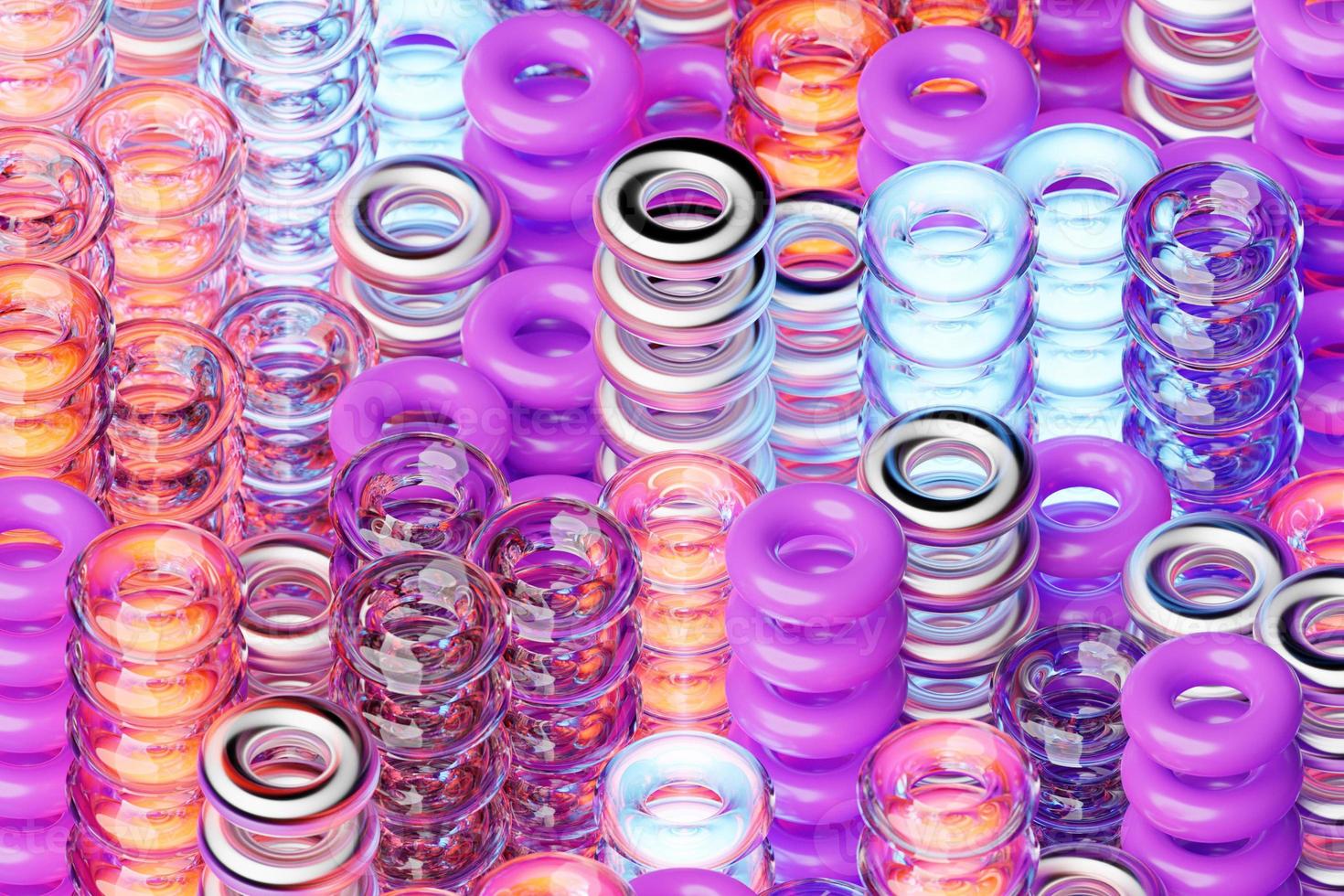 3d illustration of rows of pink and blue torus .Set of toruses on monocrome background, pattern. Geometry background Pro Photo
