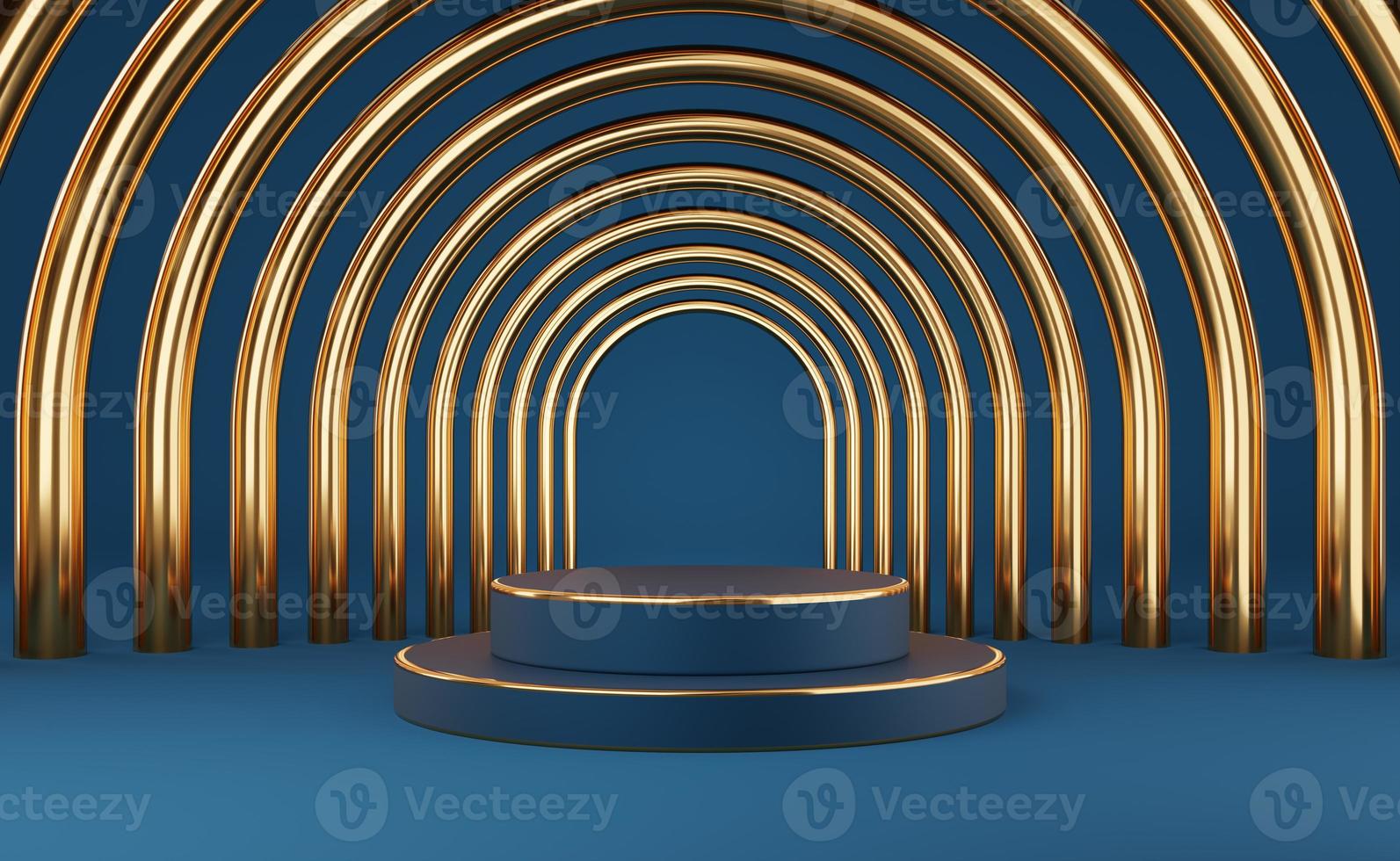 Empty blue cylinder podium with gold border and gold arch on blue background. Abstract minimal studio 3d geometric shape object. Mockup space for display of product design. 3d rendering. Pro Photo