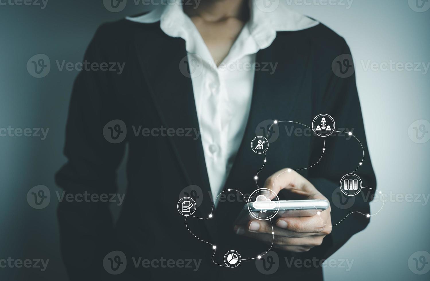 Concept global data connection with internet technology, user touch screen for online transactions by internet technology, big data, database management, cloud computing, cashless society. Pro Photo