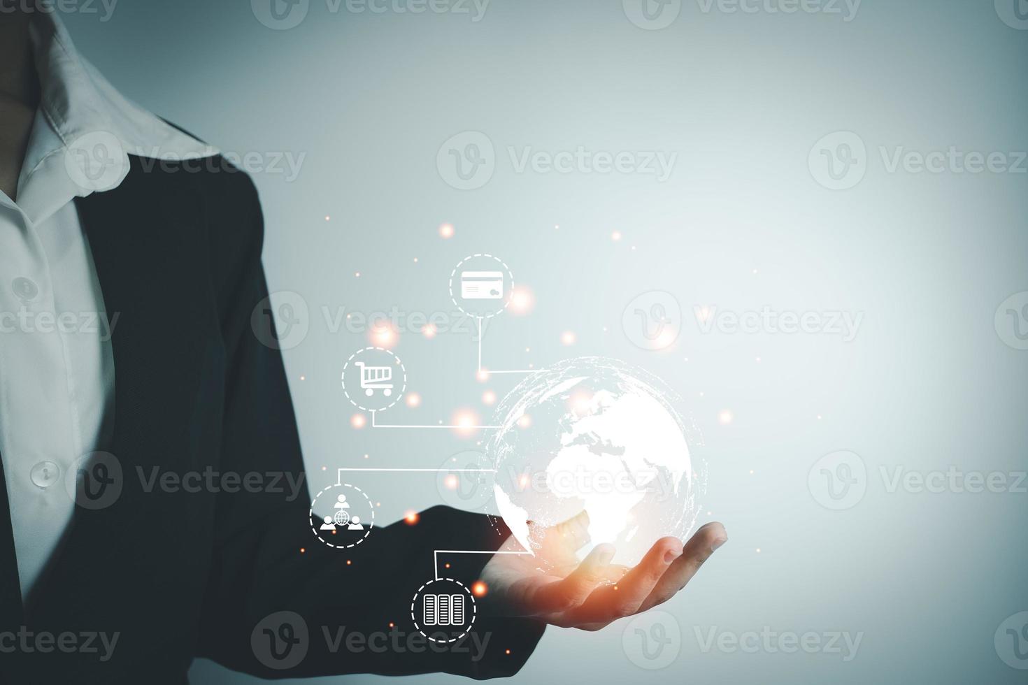 Concept global data connection with internet technology, user using smartphone for online transactions by internet technology, big data, database management, cloud computing, cashless society. Pro Photo