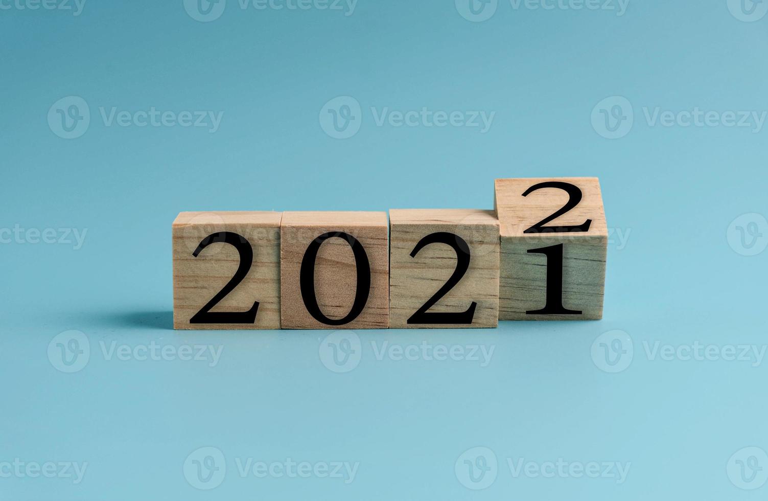Wooden cube with word 2021 change to 2022. New Year concept on blue background. Closeup and copy space on top and under for design or text. Pro Photo