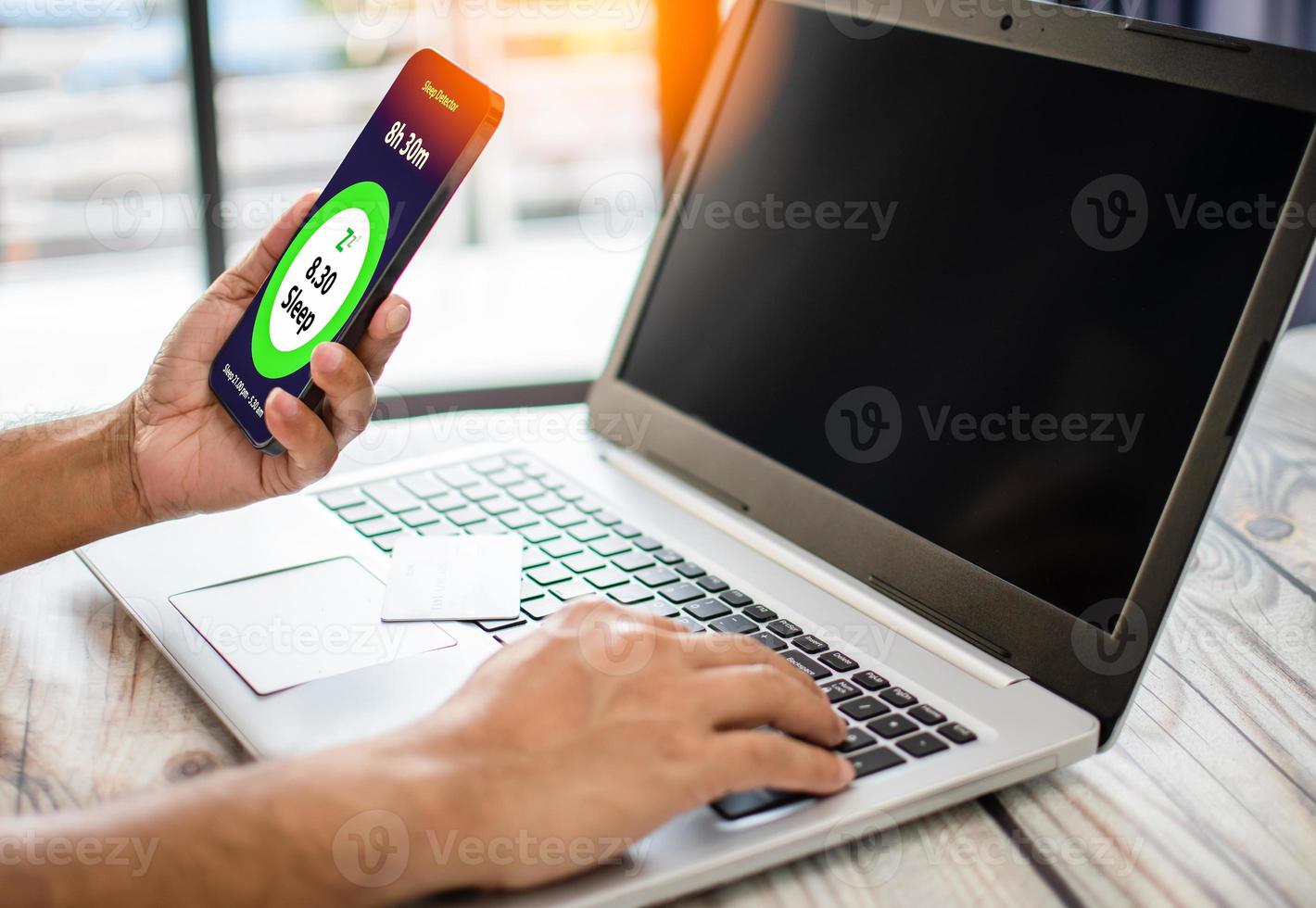 man holds smartphone to watch sleep function monitor. Mobile device screen monitors health. Concept of using technology to take care of human health by using digital devices, Internet. Selective focus Pro Photo
