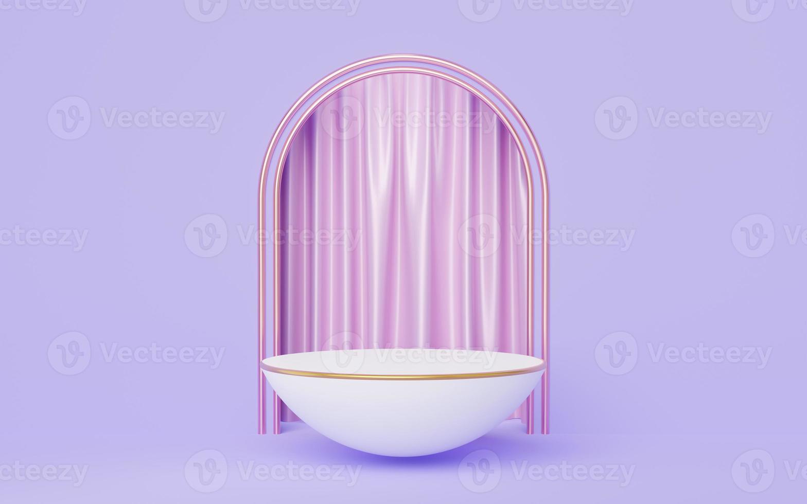 3d white half sphere podium with gold border on purple arch, pink curtain background. Empty pedestal mockup space for display product design. Abstract minimal studio geometric shape object. 3d render. Pro Photo