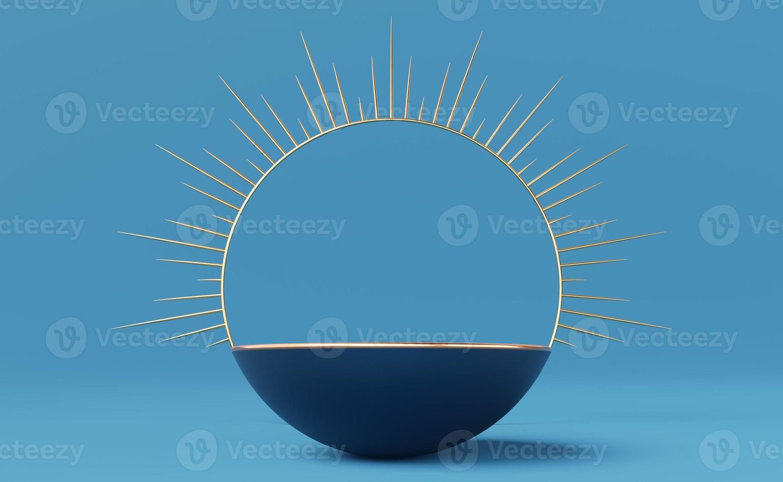 Empty blue half sphere podium with gold border and spiked halo circle on blue background. Abstract minimal studio 3d geometric shape object. Pedestal mockup space for luxury display. 3d rendering. Pro Photo