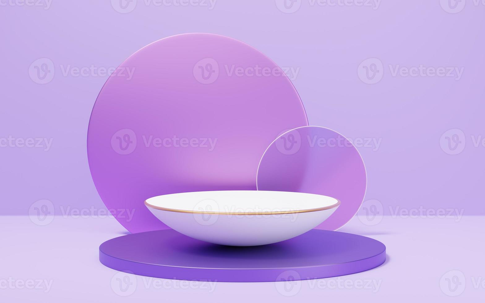3d white half sphere podium with gold border on glass arch circle purple background. Empty pedestal mockup space for display product design. Abstract minimal studio geometric shape object. 3d render. Pro Photo