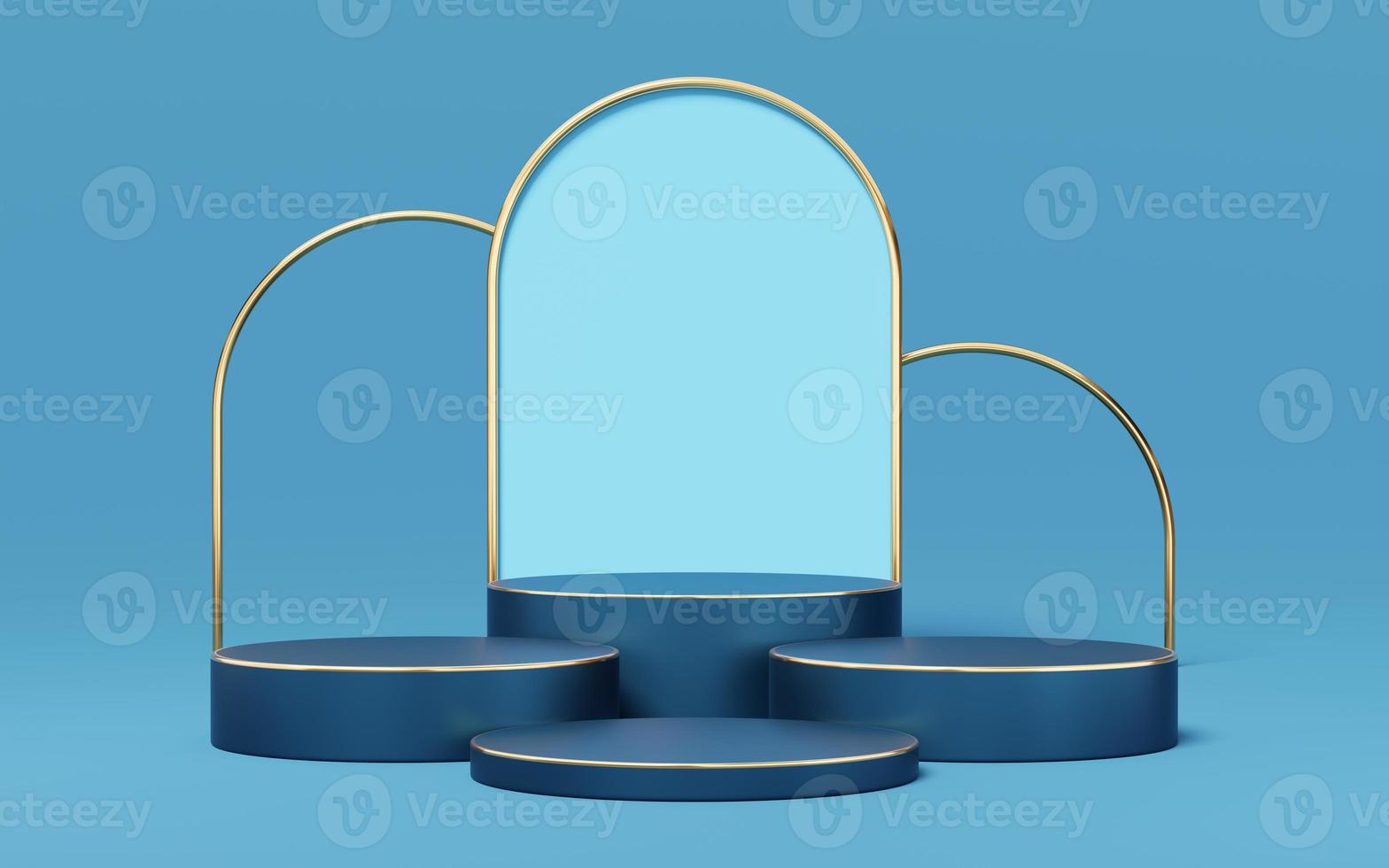 4 Empty blue cylinder podium with gold border on blue arch background. Abstract minimal studio 3d geometric shape object. Mockup space for display of product design. 3d rendering. Pro Photo
