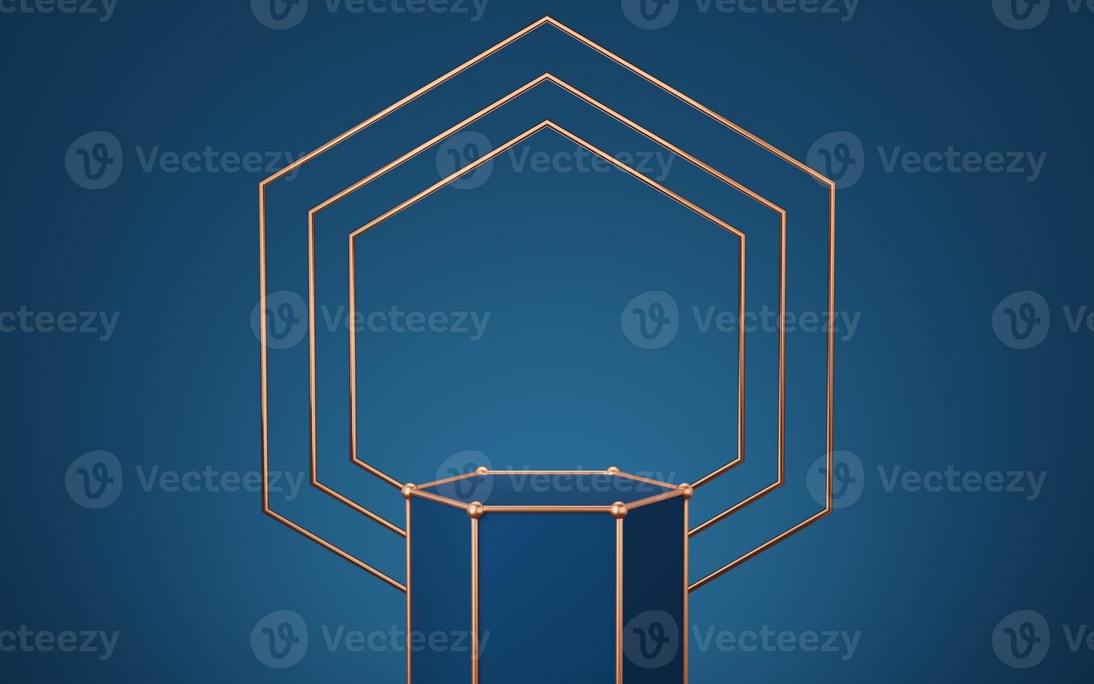 Empty blue hexagon podium with gold border and copper six polygon floating on background. Abstract minimal studio 3d geometric shape object. Mockup space for display of product design. 3d rendering. Pro Photo