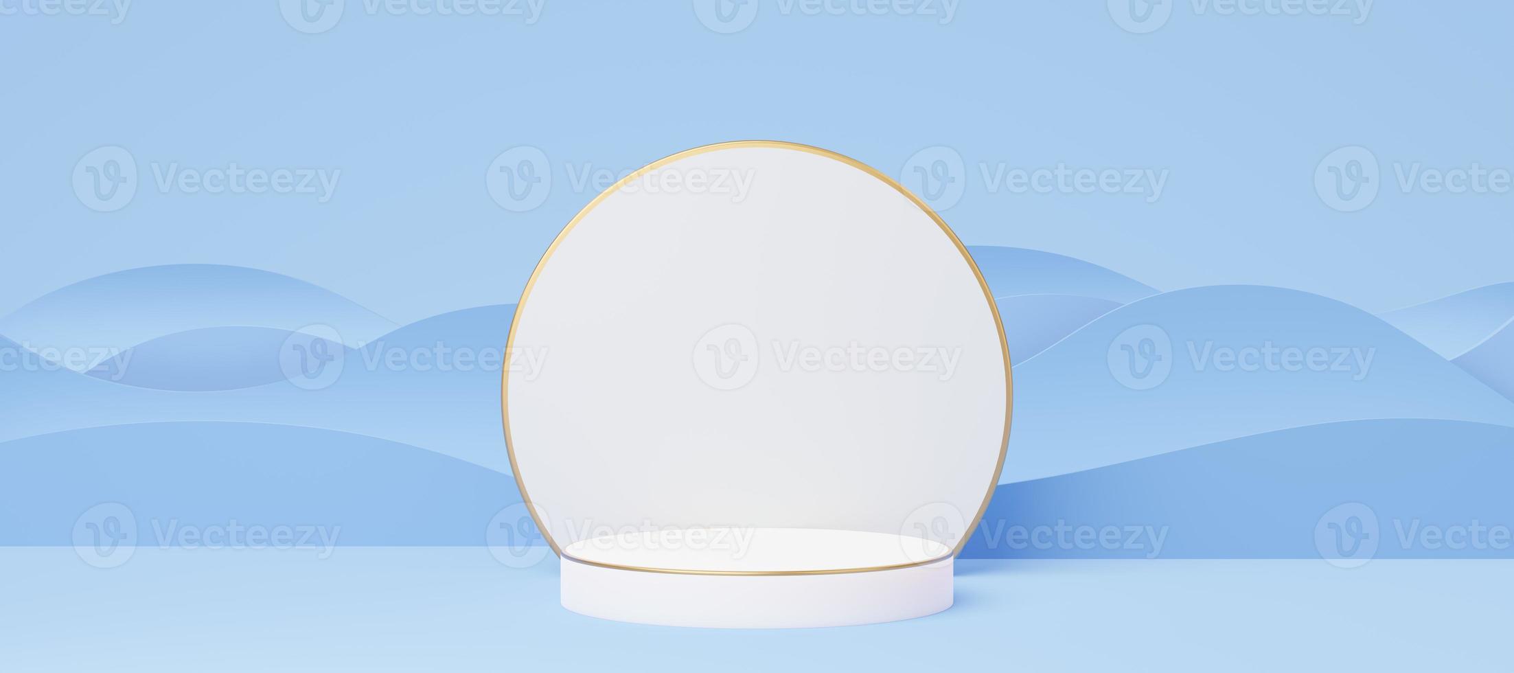 Empty white cylinder podium with gold border on blue wave background. Abstract pastel minimal studio 3d geometric shape. Mockup space for display of product design. Paper cut style. 3d rendering. Pro Photo