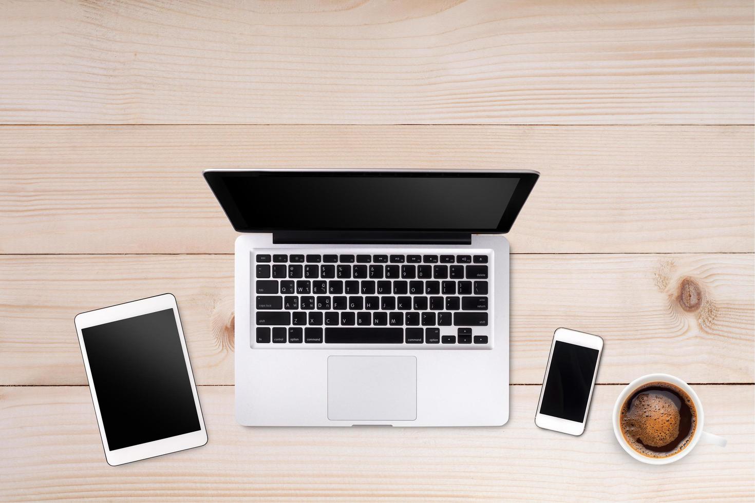 Top view laptop computer or notebook,mobile phone and cup of coffee on wooden table. Business template mock up for adding your text. Free Photo