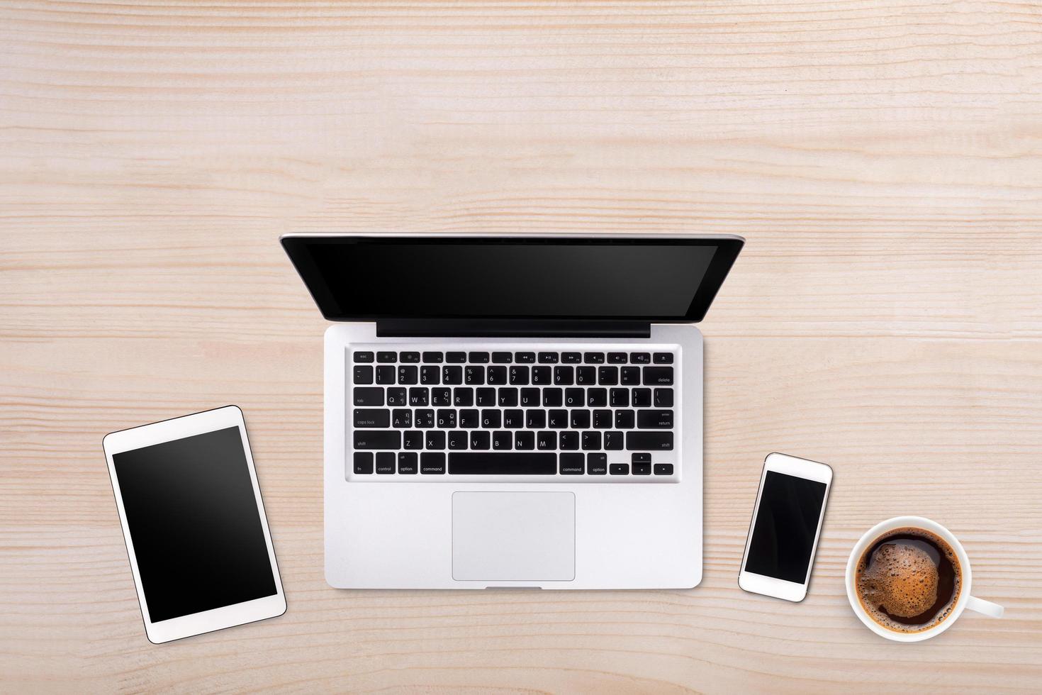 Top view laptop computer or notebook,mobile phone and cup of coffee on wooden table. Business template mock up for adding your text. Free Photo