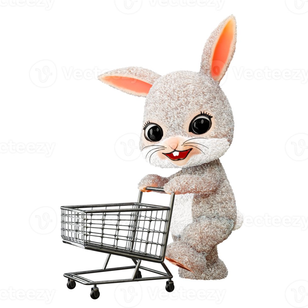 Easter bunny figure in 3D rendering, strolling while dragging an empty shopping cart. Pro PNG