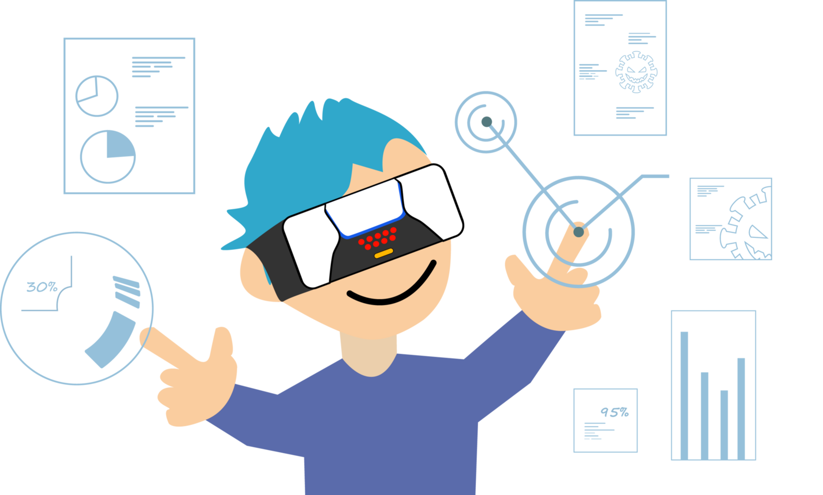 A man moving objects data and graph around using a virtual reality VR headset. business technologies. png