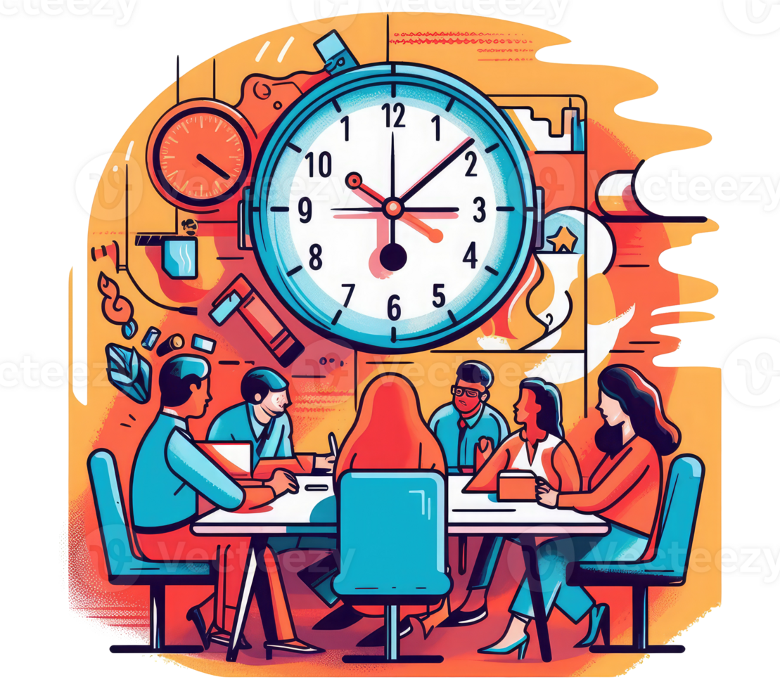 concept of effective meetings, with a diverse group of people collaborating at a modern conference table, a clear agenda displayed on a presentation screen, and a digital timer counting . Pro PNG
