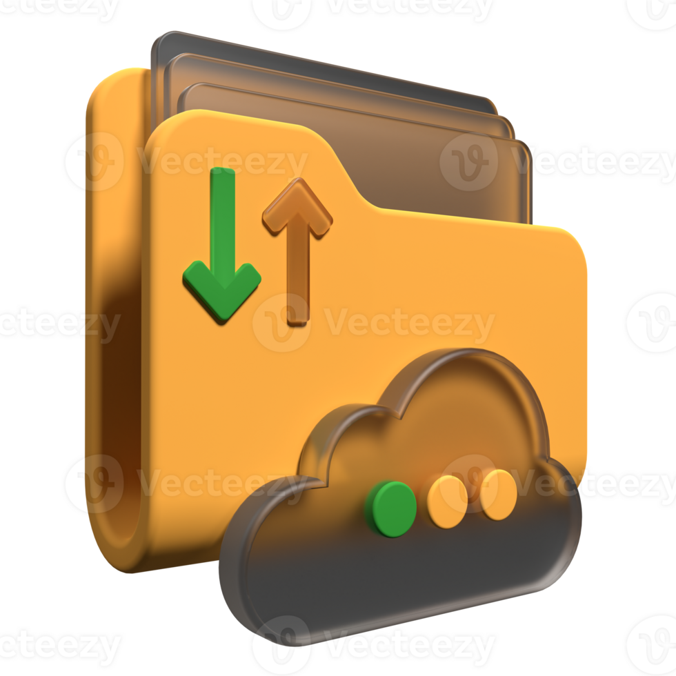 Cloud storage 3d illustration. File transfer concept. Cloud download and upload icon. Digital file organization service or app with data transferring. 3d render illustration Pro PNG