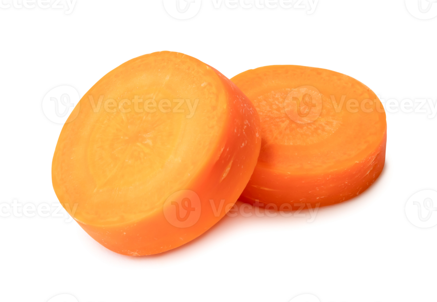 Two fresh beautiful orange carrot slices isolated with clipping path and shadow in png file format Front view. Pro PNG