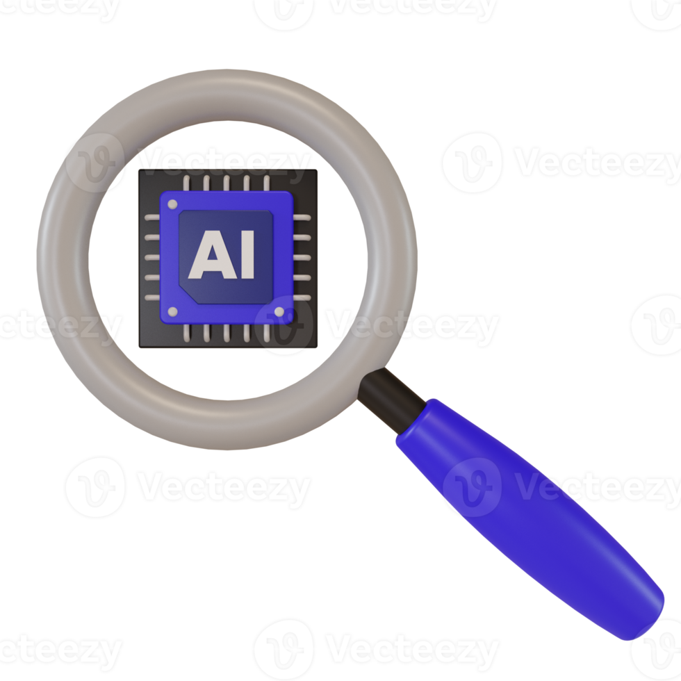 3d render AI artificial intelligence chip icon and magnifying glass icon illustration for website, application, printing, document, poster design. concept of searching using AI prompts Pro PNG