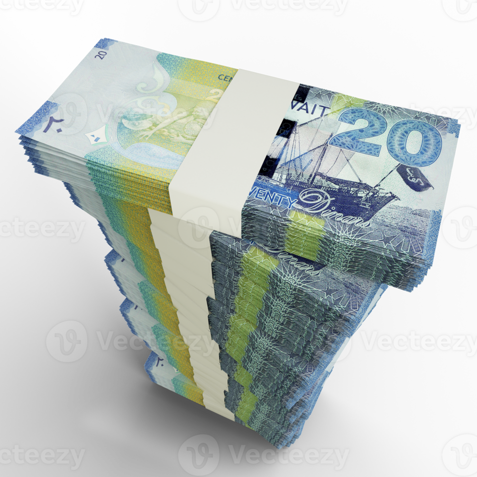 3D rendering of stacks of Kuwaiti dinar notes arranged in a long single column. 3d rendering of bundles of cash Pro PNG