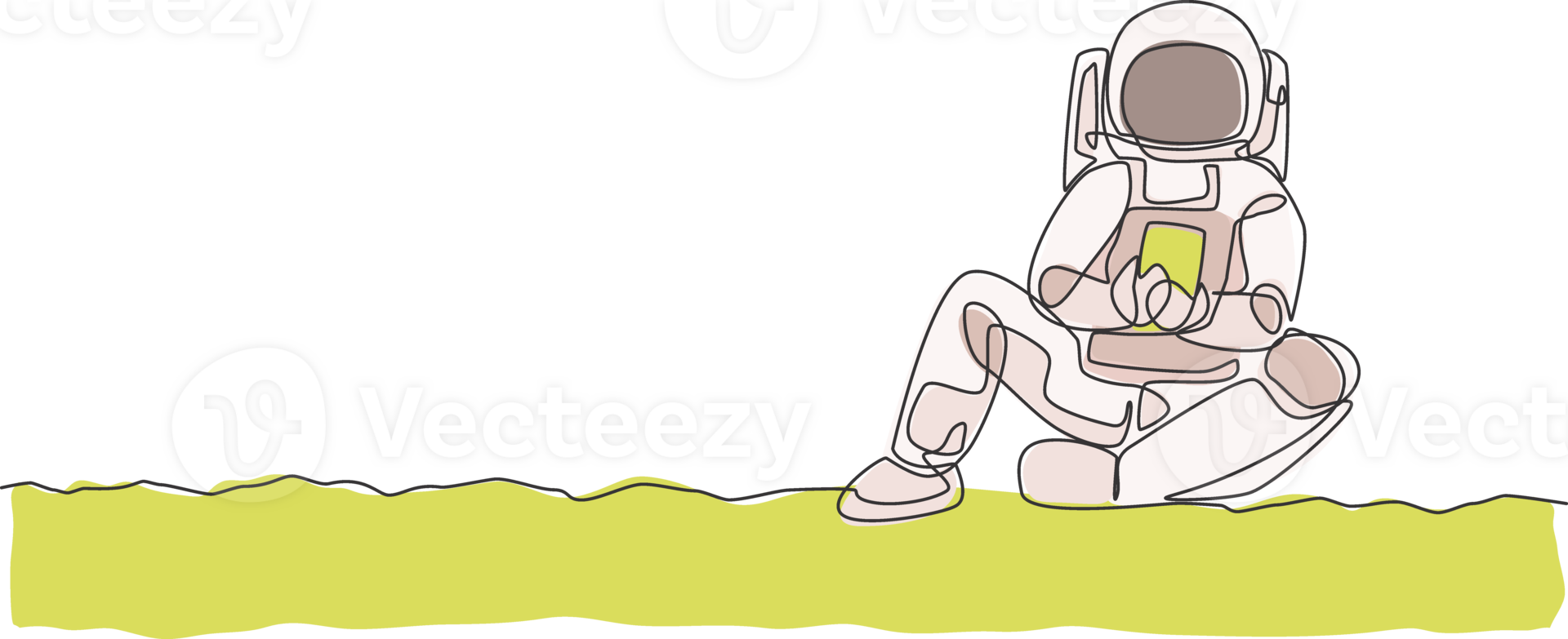 One continuous line drawing of young spaceman on spacesuit siting relax on moon surface while texting. Astronaut business office with deep space concept. Single line draw design illustration Pro PNG