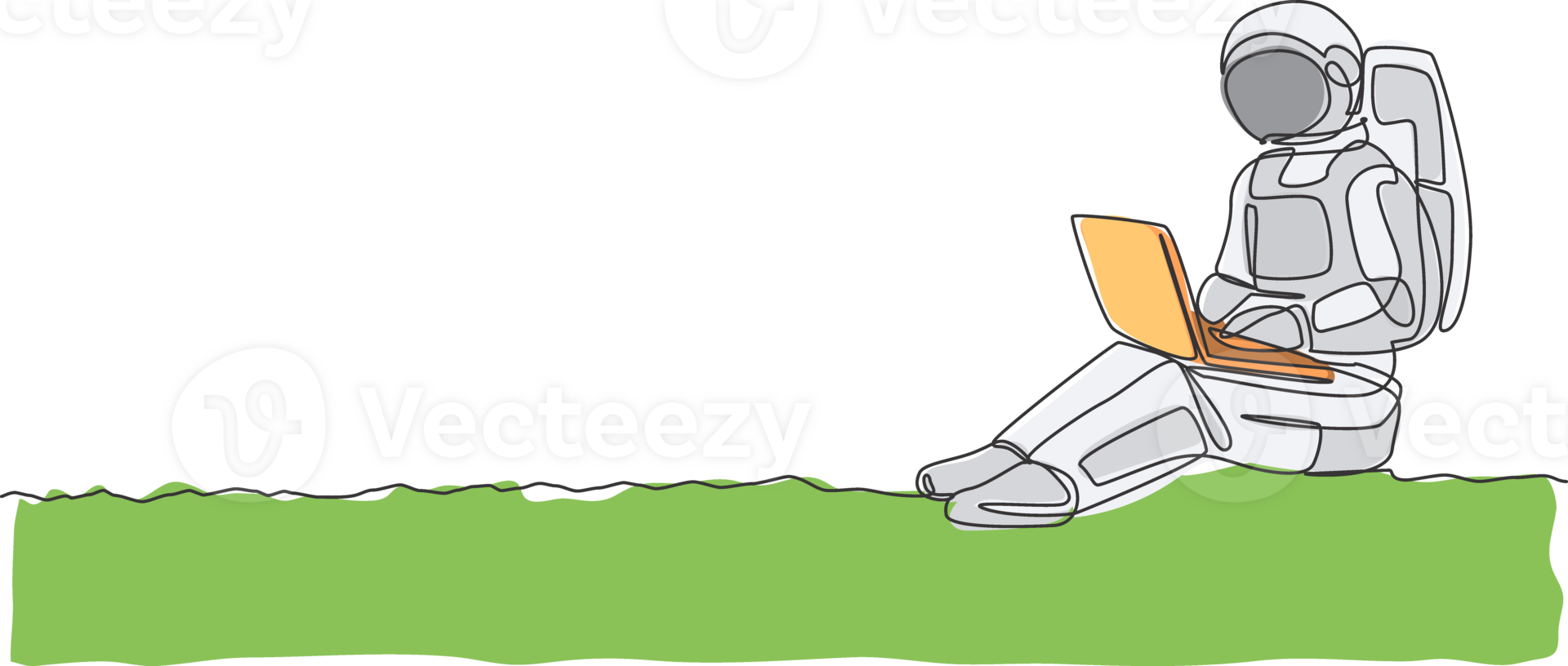 Single continuous line drawing of astronaut sitting in moon surface while typing on laptop computer. Business office with galaxy outer space concept. Trendy one line draw design illustration Pro PNG