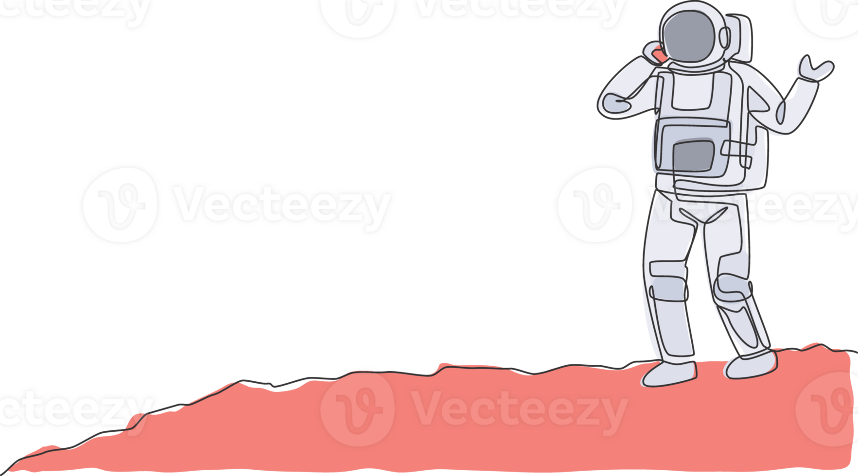 One single line drawing of cosmonaut make a call to partner using smartphone in moon surface illustration. Astronaut business office with outer space concept. Modern continuous line draw design Pro PNG