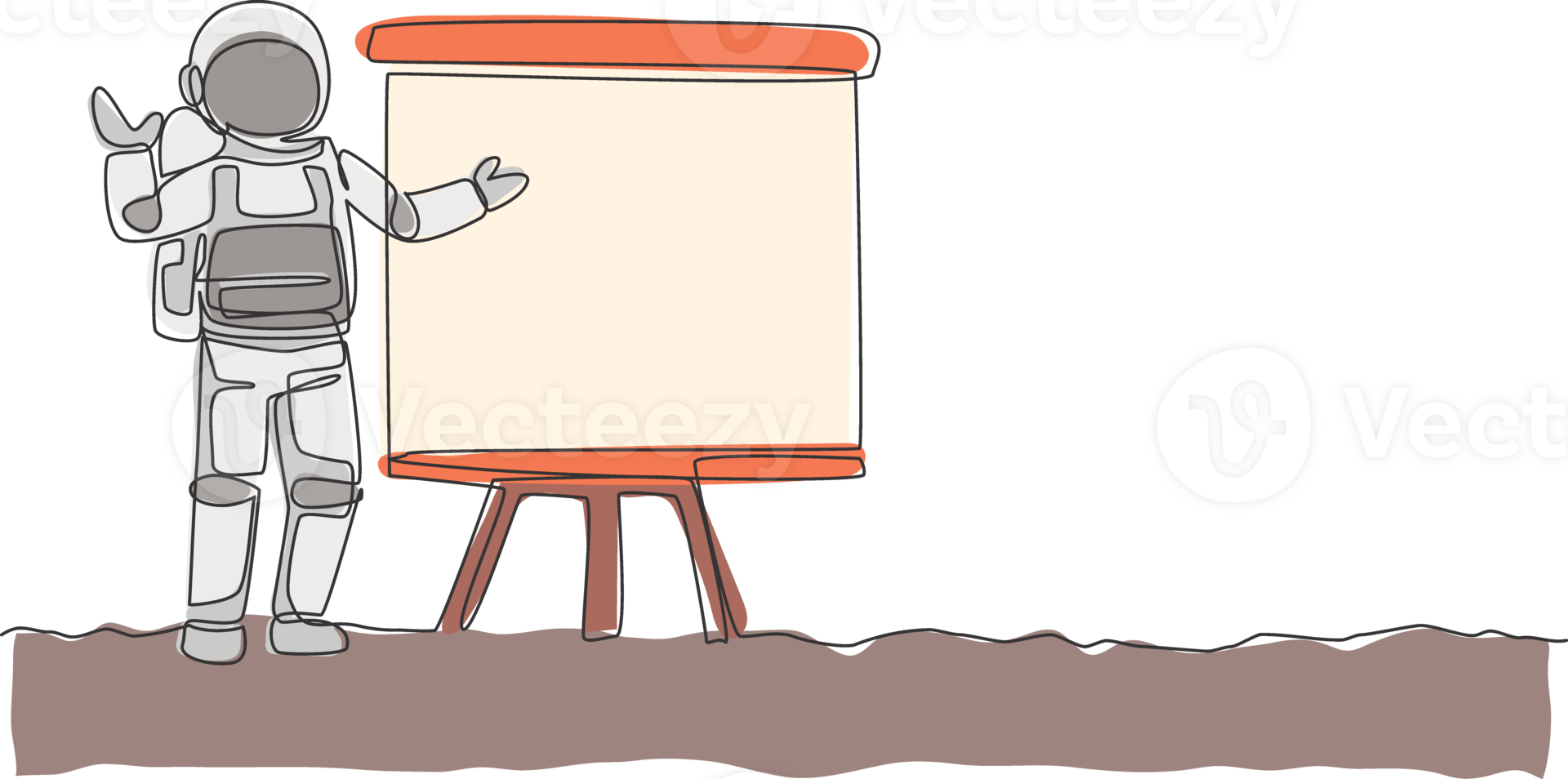 One continuous line drawing of young spaceman on spacesuit gave business presentation in meeting. Astronaut business office with deep space concept. Dynamic single line draw design illustration Pro PNG