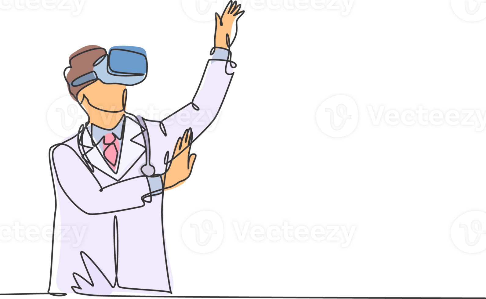 One continuous line drawing of young manager pointing finger at top hill while playing virtual reality simulation. Modern futuristic video game concept single line draw design illustration Pro PNG