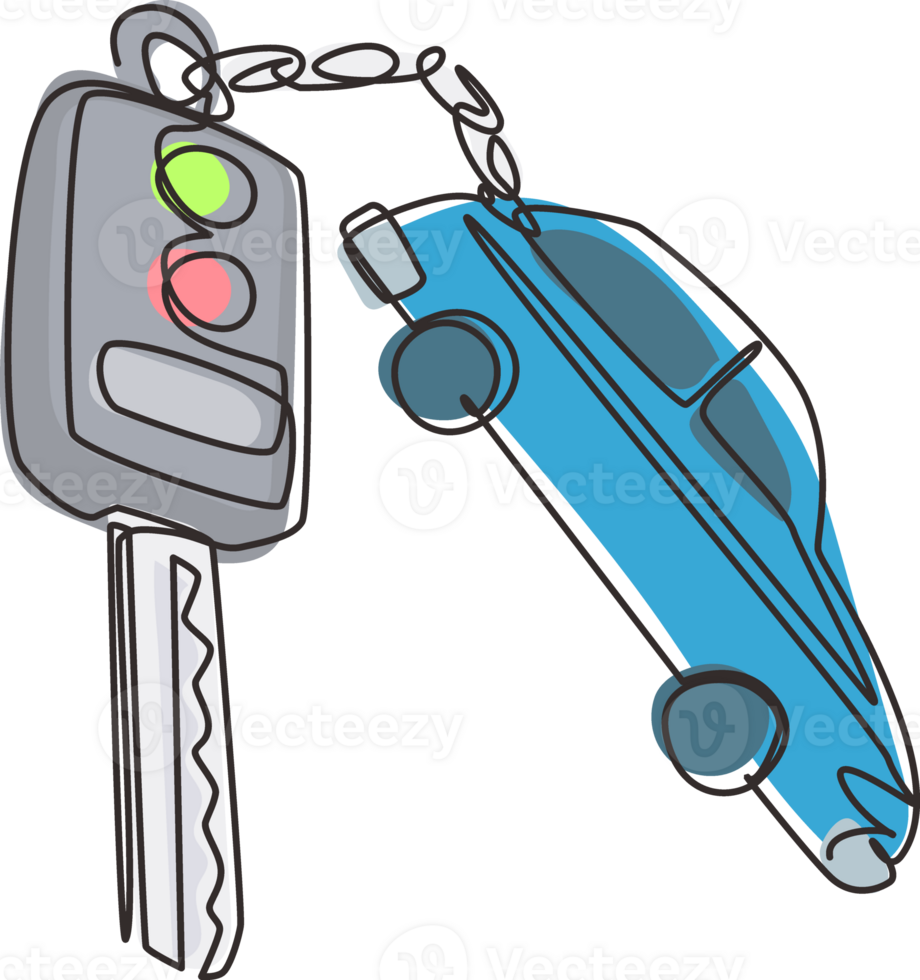 Single one line drawing key car and key ring over the metallic table. Clipping path included. Electronic car key front and back view and alarm system. Modern continuous line draw design graphic Pro PNG