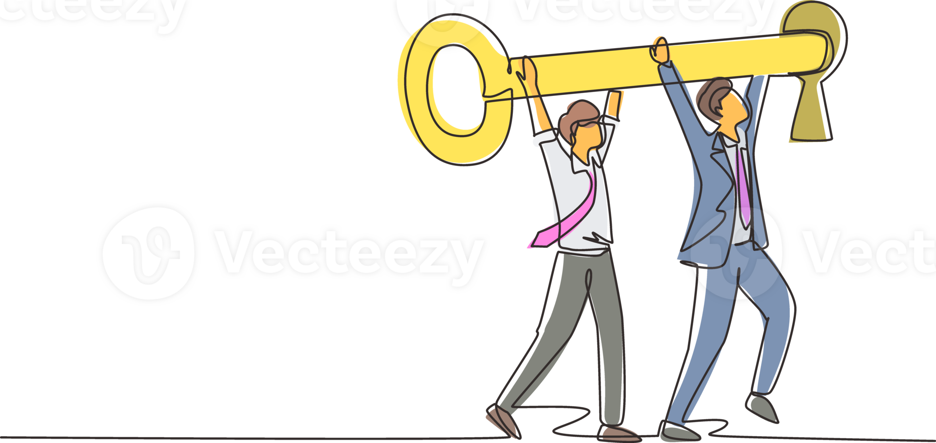 Continuous one line drawing business key concept with two male figures wearing suits while lifting and inserting the huge key to the keyhole. Business movement forwards. Single line draw design Pro PNG