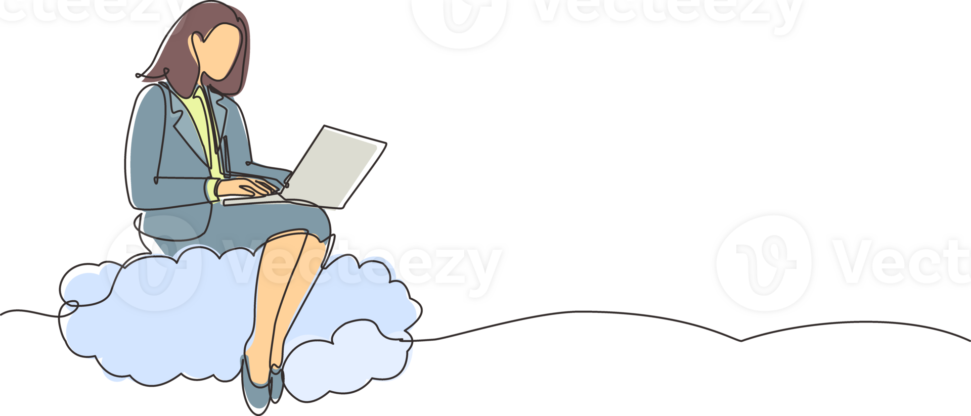 Single continuous line drawing businesswoman sitting on cloud in sky and working with laptop. Wireless connection. Social networking, chatting using cloud storage. One line draw graphic design Pro PNG