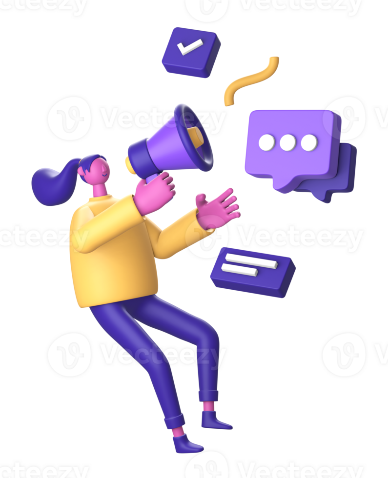 3D Character with loudspeaker and speech bubble message for UI UX web mobile apps social media Pro PNG