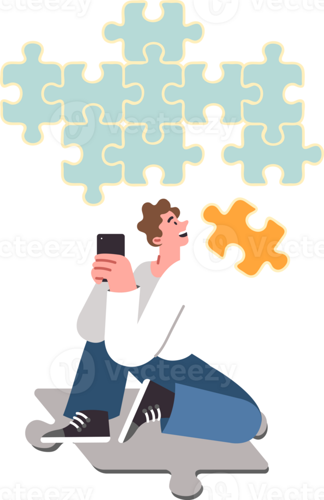 Teenager guy with phone playing application with logic game, putting puzzle cubes together, sitting on floor. Concept of using mobile application with task manager to plan your own time Pro PNG