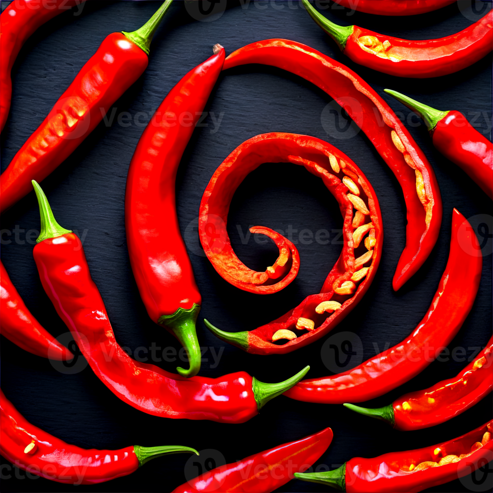 AI Generated A red cayenne pepper cut into thin strips, with the strips arranged in a spiral pattern, captured from a Pro PNG