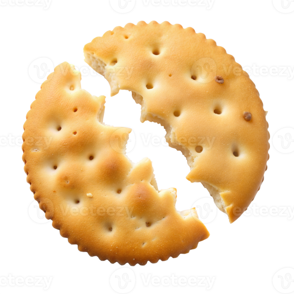 A close-up image of a round cracker with a bite taken out. The cracker has a light golden brown color and a textured surface. The cracker is isolated on a transparent background Pro PNG