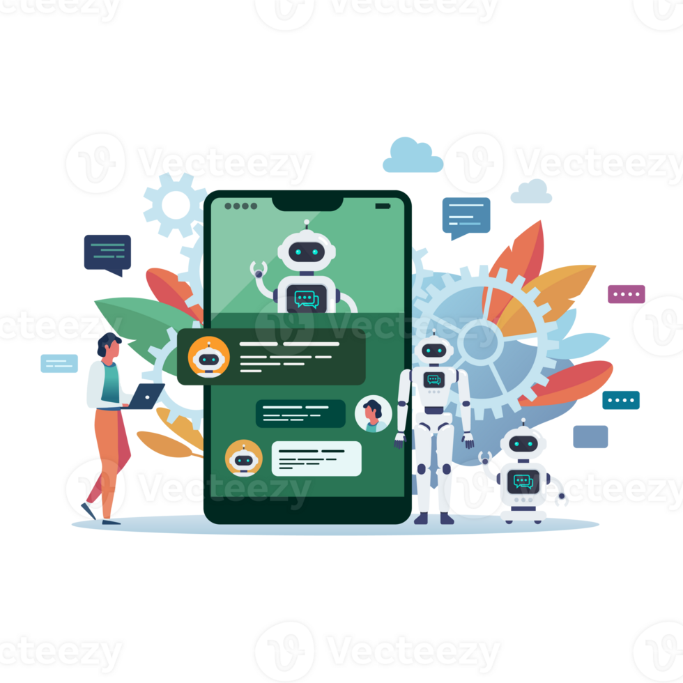 Man chatting with android robot or chat bot on smartphone screen. Artificial Intelligence Pro PNG