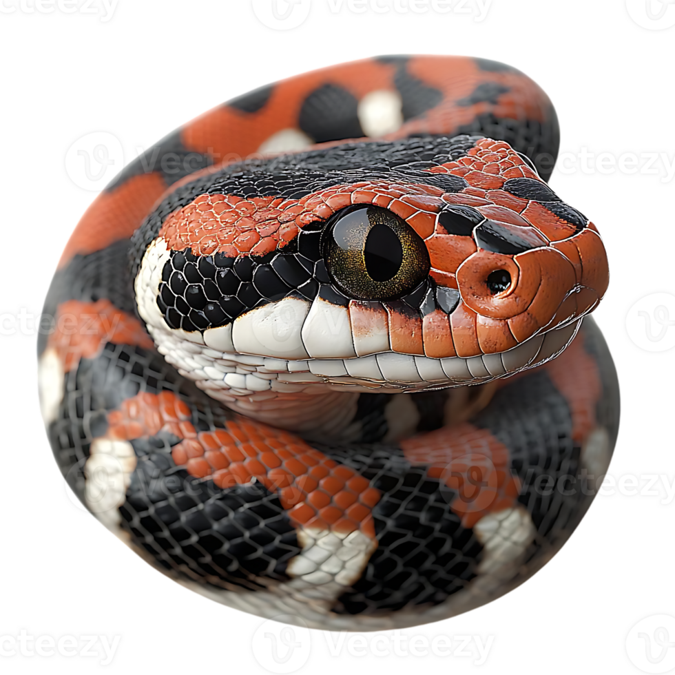 Red and Black Snake with Transparent Background, Coiled and Looking at the Camera, Close-up of Scales, Reptile with Sharp Eyes, Snake with a Sharp Gaze, Isolated on Transparent Background, Red and Black Snake with White Stripes, Snake with a Striking Patt Pro PNG