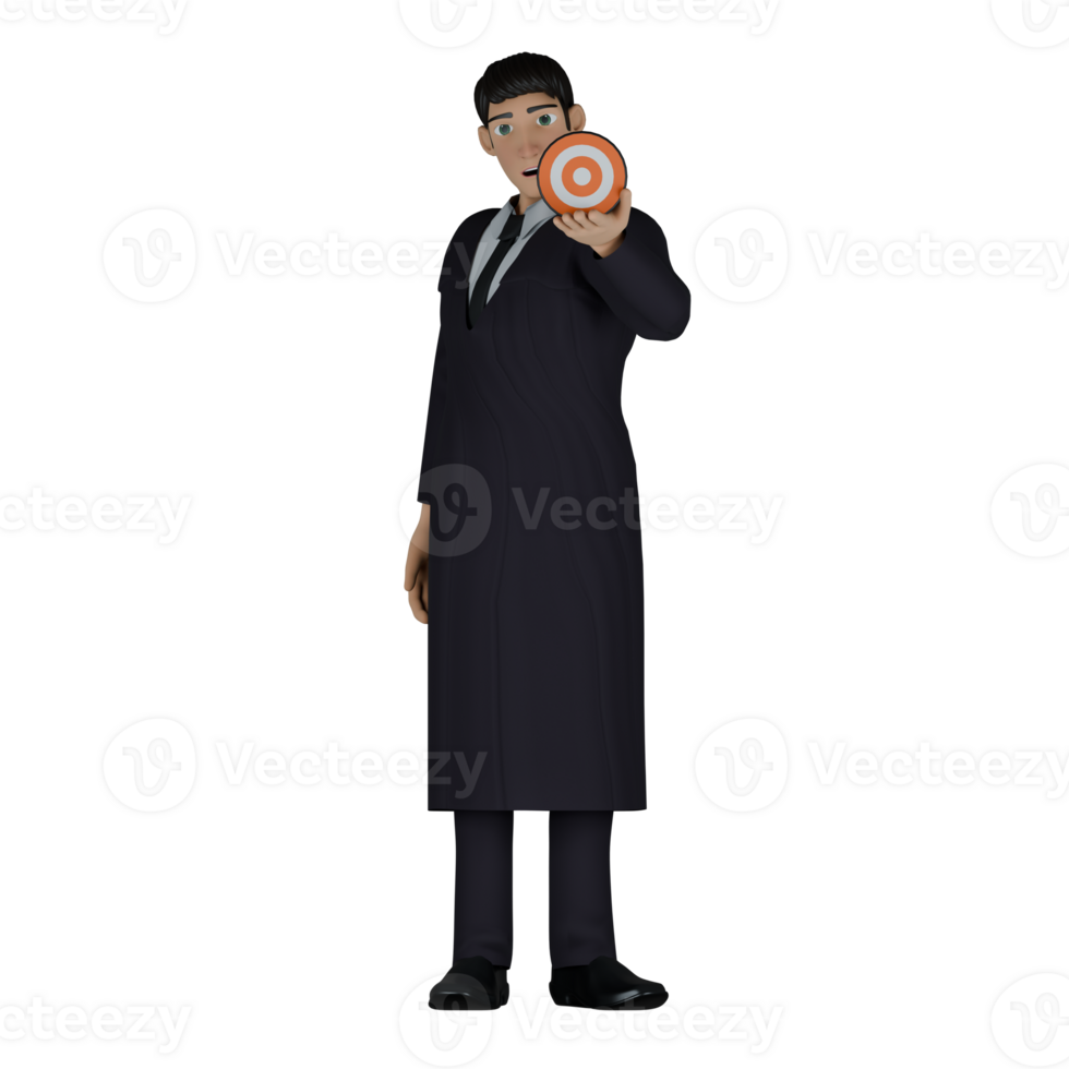 Male Judge in Judicial 3D. A male judge is seen standing with his left hand raised parallel to his face, while pointing at a dart board target. Professional Pro PNG