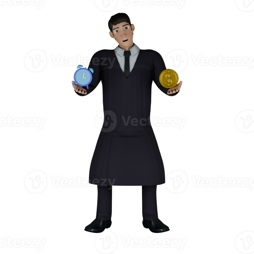 A male judge stands with his right palm raised parallel to his shoulder while carrying an alarm clock while his left palm is also raised parallel to his shoulder while carrying a gold coin. Pro PNG