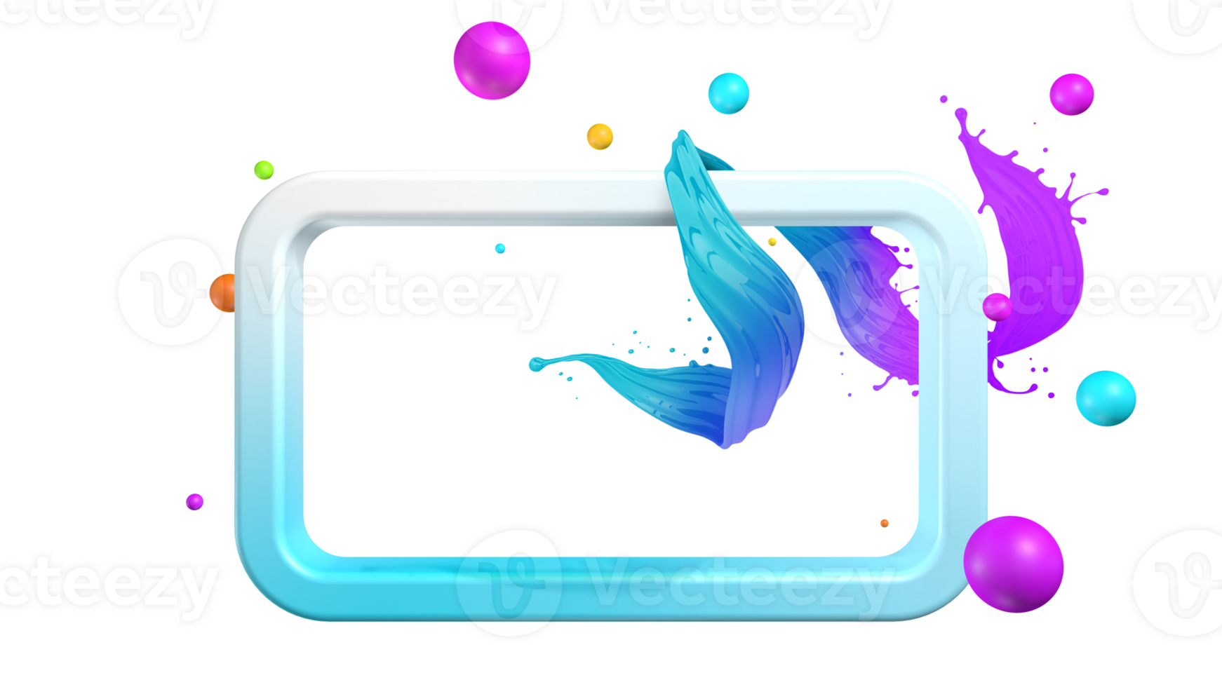 Abstract composition with a rectangular light blue frame with a splash of violet liquid surrounded by spheres floating against a gray background. 3D Illustration Pro PNG