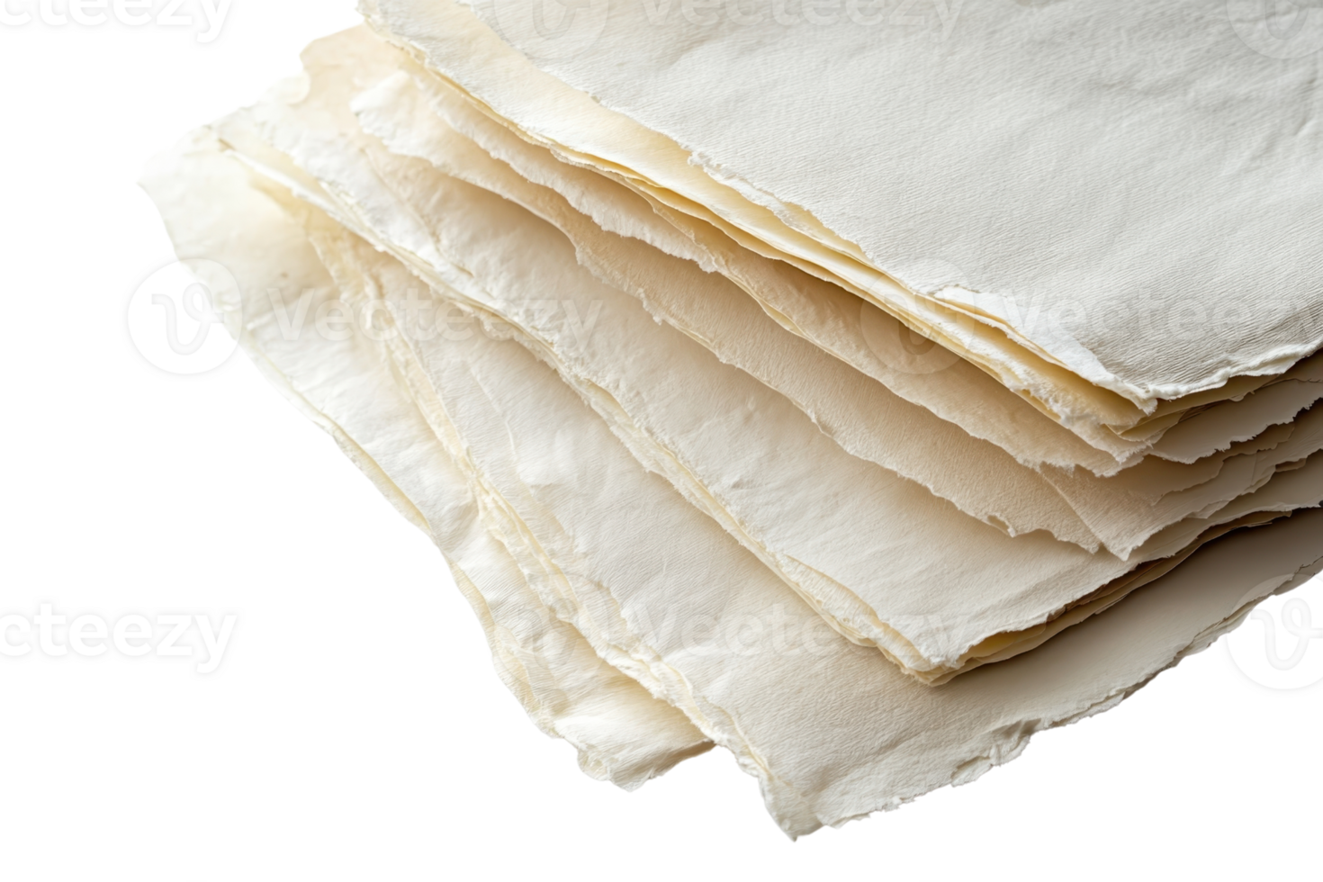 A close-up image of a stack of handmade paper sheets with rough edges, showcasing texture and craftsmanship in neutral tones. Pro PNG