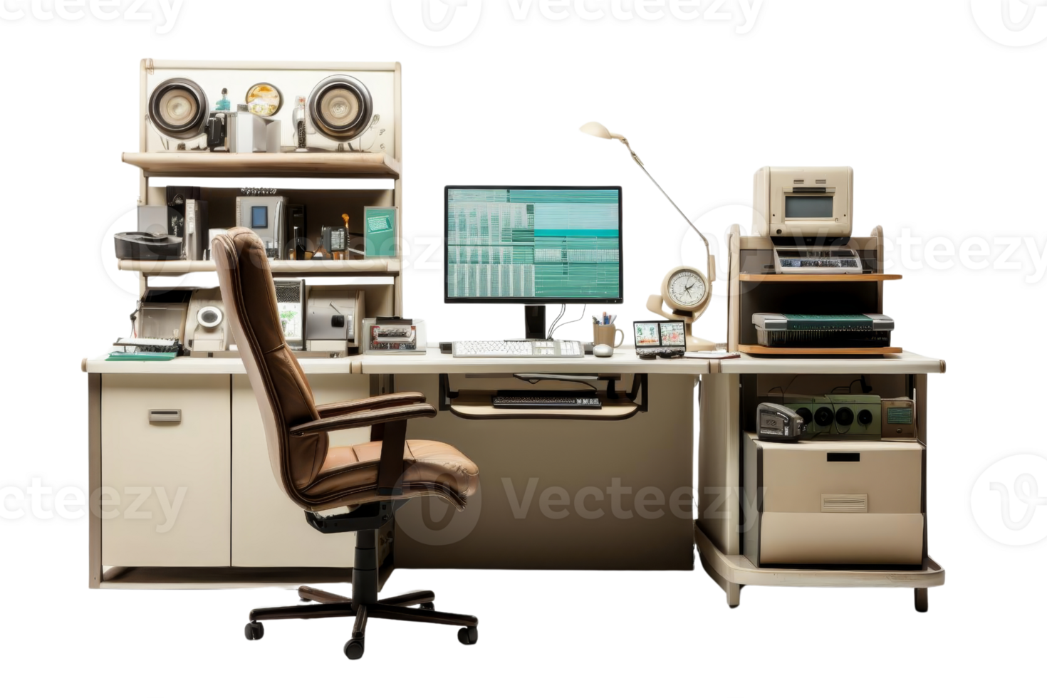 A computer desk with a brown chair and a computer monitor. The desk is cluttered with various items, including a clock, a keyboard, and a mouse. Scene is that of a busy workspace Pro PNG