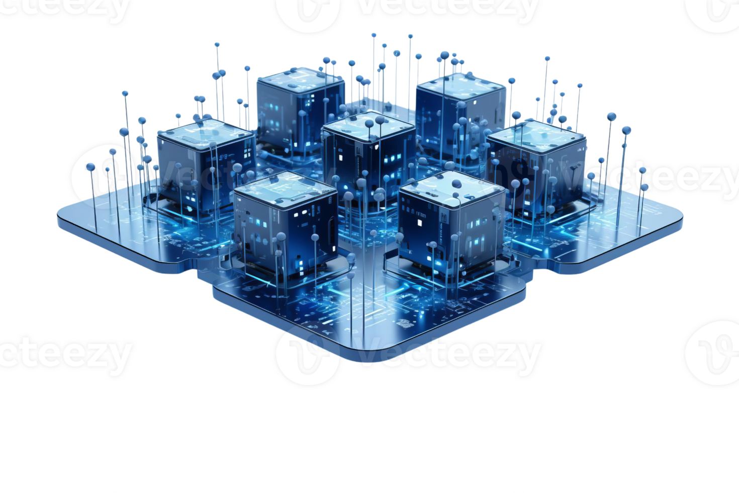Abstract image of a futuristic data center showcasing interconnected technology, data storage, and digital networks. Pro PNG