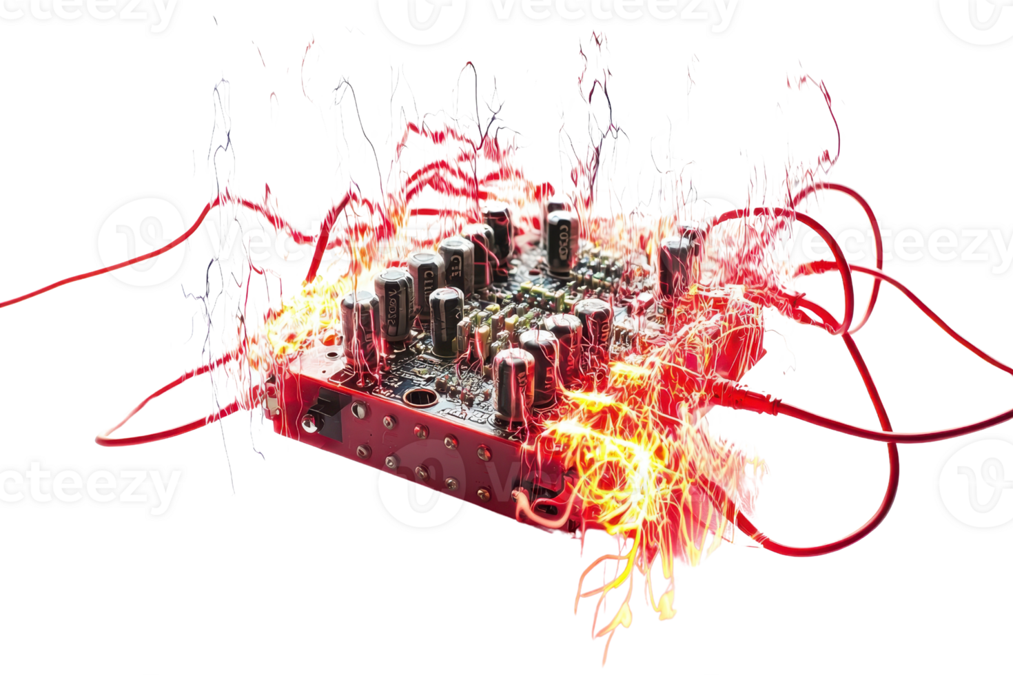 A vivid depiction of a circuit board with vibrant, exploding wires showcasing energy and motion, symbolizing tech and electronics innovation. Pro PNG