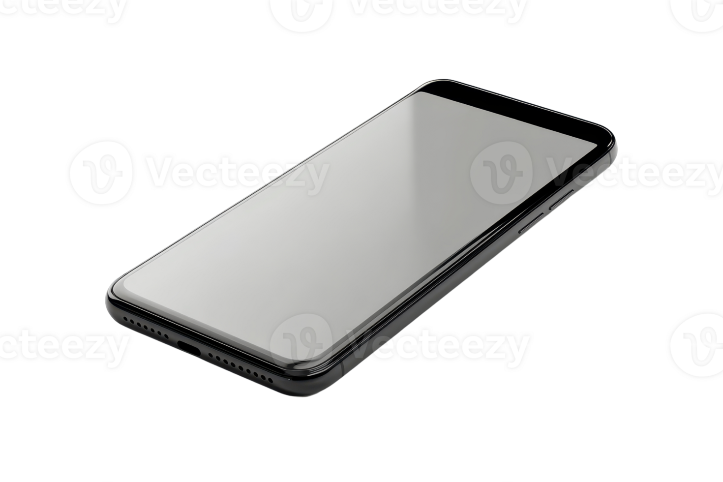 Modern black smartphone with blank screen, angled view on a transparent background. Perfect for technology, communication, and mobile app design concepts. Pro PNG